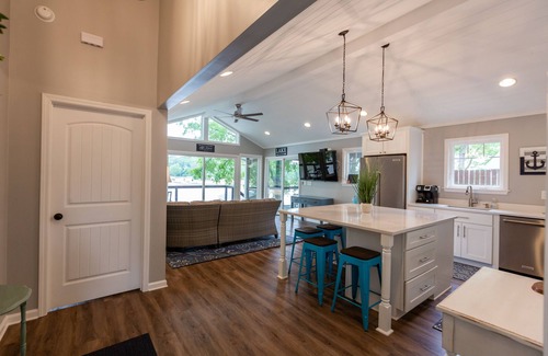 Our fully equipped kitchen has everything you need to cook a great meal, including a gas stove and oven. You can enjoy dinner with a view at our large island bar with four stools. The screened porch and deck provide waterfront views. They are a great place to sit back, relax, and enjoy a cup of coffee or a glass of wine.