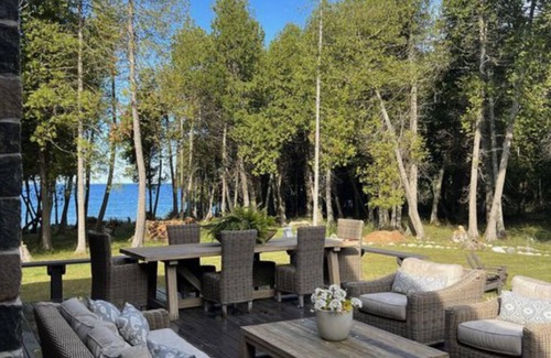 This private 4 bed, 3 bath Island property with 600' of waterfront on two bays, Marquette and Wilderness and 10 acre parcel of forest nestled on Marquette Island. Only access is by boat, therefore renter must have there own boat. The 3,000 ft2 main home was completed in '22. Primary home includes three beds, 2.5 baths with the master suite on the main floor. Entertain in the great room with a stone fireplace, or on one of 4 porches or the large open deck. Relax in the wood-fired sauna or enjoy spectacular views of the islands. Mackinac Island is a short boat ride away. Spacious commercial grade kitchen. Mainland dock and parking included. The crib dock can accommodate several boats. Beautifully furnished and ready for visitors.Must have your own boat.
