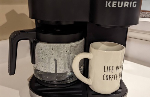 Fully equipped kitchen, including a dual Keurig K-Cup and traditional coffee pot for your morning brew