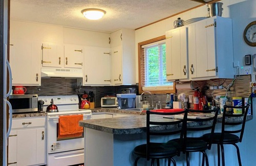 This lovely property features a spacious open layout, perfect for gatherings and celebrations. You’ll find a comfortable living room complete with a large sofa and a pellet stove fireplace, while the dining area can accommodate your entire guest list with its extendable table. The fully-equipped kitchen has everything you need to prepare delicious meals, and the newly renovated bathroom includes convenient laundry facilities. Outdoor amenities include a large deck with a propane grill for al fresco dining, a private dock for scenic views, and a campfire pit for cozy evenings under the stars. With two bedrooms and additional sleeping options, including pull-out sofas and Aerobeds, there's ample space for family and friends to relax.