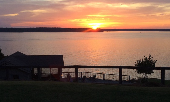 Cozy and romantic one room (400 sq ft) log cabin, spectacular waterfront sunset views on beautiful 70,000 acre lake! Luxurious King size bed, loveseat with big screen TV for movie night! Extra shower outdoors, fabulous screened porch, small beach for floating your cares away, enjoying a sunset glass of wine, or gazing at incredible starry night...
