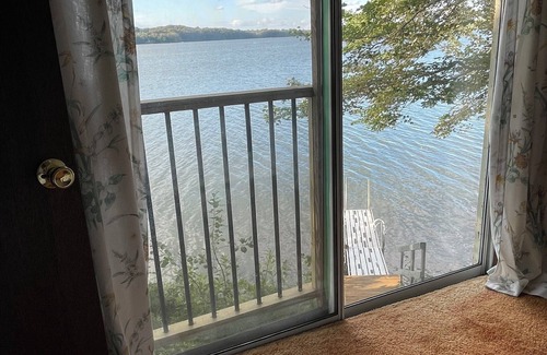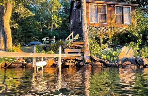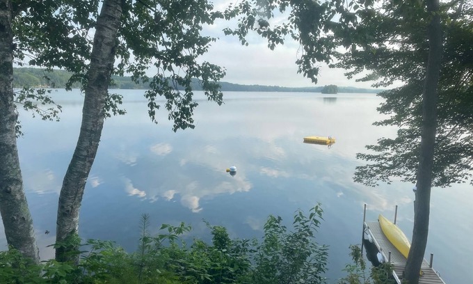 1BR with King, 1 pull out couch, 15' from the edge of the shore, this cozy cottage is convenient, peaceful with outstanding views. Legendary fishing, great swimming(starts in May), boating, paddling on quiet large lake. Come relax, listen to the haunting call of the loons, see eagles, herons, hummingbirds and relax in full day dappled sun. Serene beauty. Large bedroom with King size bed, sliding glass doors let you wake up to the sunrise and watch the sunsets at night. If you need a separate bed, the new couch is a full pull out couch. The wifi is excellent; bring your Fire stick or Roku for TV if you can take your eyes off the view through the living room sliders. Well appointed Kitchen has full size appliances, microwave, toaster, coffee maker, griddle. AC, fans, electric heat. Your own gas Grill; campfire, kayaks, SUP, dock shared between 2 camps. End of April- mid October when owner is not using. Not the place for bachelor parties nor loud groups but guests that enjoy the beauty of nature. Water is lake drawn so first 4 gallons of drinkable water is supplied. Bring your own or get at major grocery store 5 mins away.