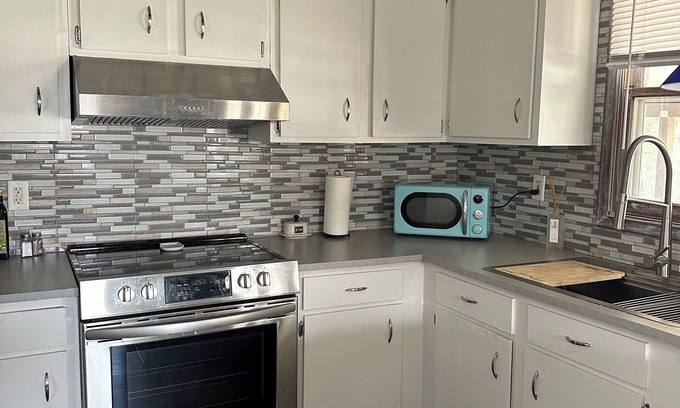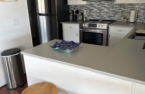 If you’d like to cook your own meals, the kitchen has full sized appliances along with a microwave, toaster oven, toaster, crockpot, coffee maker, blender, and all the cooking and serving utensils you need. The full bathroom has a step-in shower. Both bedrooms are equipped with dressers and spacious closets. The primary bedroom has a king bed and the secondary bedroom a queen bed.