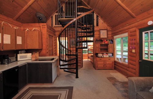 Inside, a spiral staircase leads to a loft with a queen-sized bed. The spiral staircase is a fun touch, but something to be mindful of, as it may not be suitable for very young children or older guests. The main floor includes a small bedroom with bunk beds and a full size sleeper sofa in the living room, making it ideal for families or small groups.