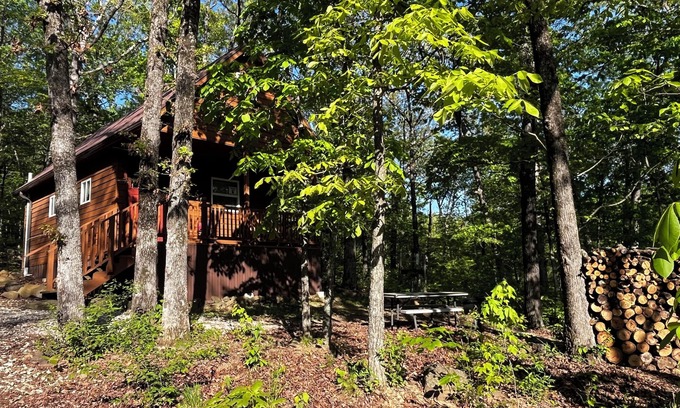 This cute little cabin sits down in a wooded holler near Winslow, AR, is 10 minutes from Devils Den State Park, and just 25 minutes from Fayetteville. Enjoy the quiet, peaceful woods with the amenities of a "tiny home" style cabin. BBQ grill, firepit, and picnic table at each cabin. Perfect for a quiet getaway for 1, 2 or the whole family. Great for a Razorback sports events and more. The front porch rocker has a beautiful view. The pond is fun for fishing, riding the "peddle boat" or a kayak. The playground is waiting for the kiddos. There are 6 cabins available so share with your family and friends and have a great gathering for the weekend. The cabin has WIFI, is stocked with linens, dishes, a smart TV & DVD player. You can easily get a data signal on your phone.