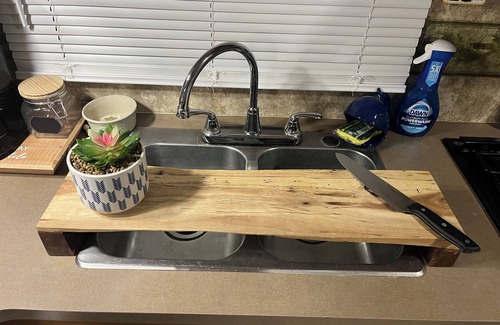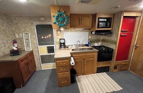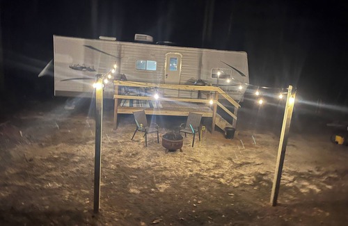 One bedroom, one bathroom camper with a nice front porch. It’s a great place to kick back and relax with a fire and maybe grill something delicious on our provided amenities! enjoy a complementary bottle of wine on us! It is a quiet escape from city life, nestled into the countryside. Perfect for couples retreat or lone travelers.