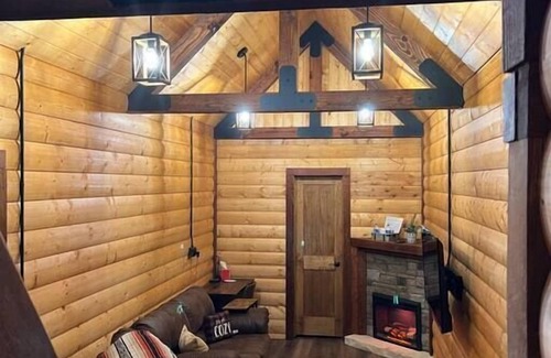 Escape to the Cozy Cabin, a charming loft-style room inspired by the warmth and simplicity of a cabin retreat. This inviting space features real wood log siding walls, exposed rustic beam ceilings, and a beautiful stone fireplace — all wrapped in modern comfort. Located at the heart of downtown Sabetha within the Limestone Lodge, you'll enjoy a prime location on Main Street near dining, shopping, and local attractions.