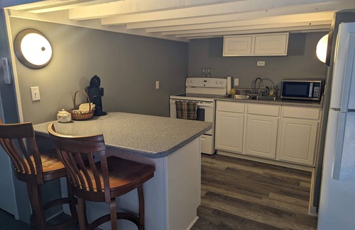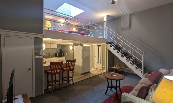 Welcome to our cozy loft hideaway! This charming 1-bedroom loft offers a comfortable and centrally-located retreat for your stay. Conveniently located in the town square with a fully equipped kitchen, a tranquil bedroom with a skylight, and on-site laundry, this space is perfect 1-2 people exploring the area. Book your stay now and experience local comfort and charm.