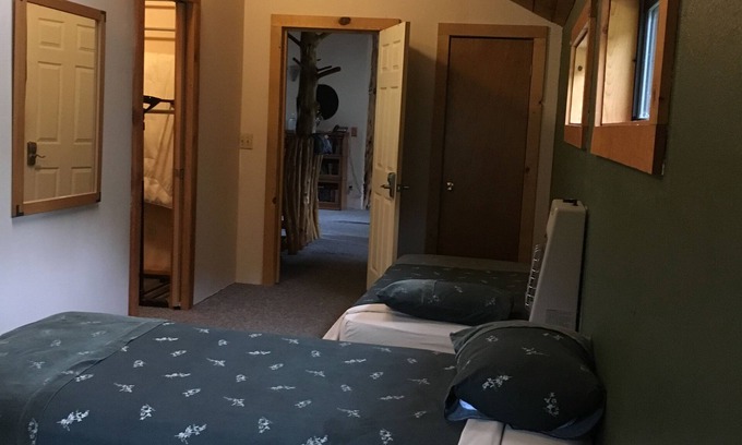 This area is in the upstairs of my home, & accommodates families well. The vaulted ceiling & skylights trimmed in pine give the room an open feel with natural light.Two sleeping rooms open off the side of the main room separated by sliding pocket doors. One room is furnished with a full size bed and dresser, the other has a twin bed and chest. There are three twin beds in the open room, easily accommodating six guests.