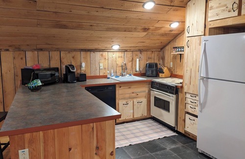 Newly remodeled mountain loft is tucked away in a quiet woodsy setting, with sleeping for 4. The loft has a spacious deck with high top table and chairs for taking in the beautiful mountain views. Rustic interior has full kitchen with bar seating and table and chairs for 4. The kitchen has stove, oven, refrigerator, dishwasher, air fryer, Keurig coffee maker, microwave, toaster. Utensils, pots and plans along with basic seasonings and spices are provided. Soap and dishwasher detergent provided.