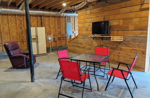 The lower level has rec room and laundry areas. The rec area has a TV, ping pong table, a second refrigerator and table/chairs for 4. The laundry has washer/dryer/sink. Laundry soap and such are provided.