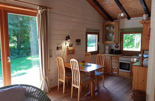 Detached holiday home, quiet location, 3 km to the beach, sauna, pellet stoveThe log house is 54m² and offers sleeping facilities for 5 persons. It has a bedroom with double bed and a bedroom / children's room with bunk and single bed and optional additional cot. Across the hall you reach the living area with south-facing terrace, integrated kitchen and dining table and the bathroom. On the 8000m ² property there are generous lawns and old trees, a pond, various games for children, a spacious children's play house, sandpit, swings and two trikes. The log cabin has a sunny terrace with garden furniture, sun loungers and barbecue. In the adjoining building there is space for bicycles brought along and further storage space. Parking directly at the house.