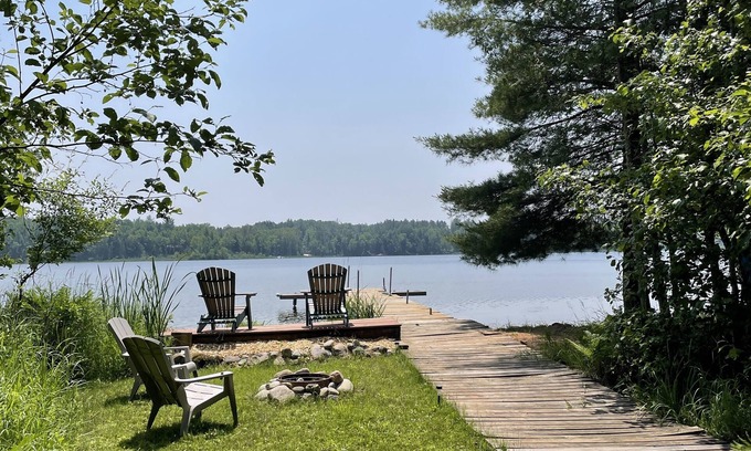 Enjoy this open concept, waterfront log cabin on a 140 acre all recreation lake! This cabin offers relaxing accommodations for anyone looking to get out of the city and enjoy the Northwoods. Enjoy a cup of coffee from the covered porch or watch the beautiful sunsets from the dock. Spend your days kayaking, swimming, fishing or boating. Relax in the evening around a warm campfire listening to loons while enjoying smores.
