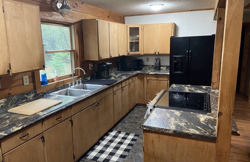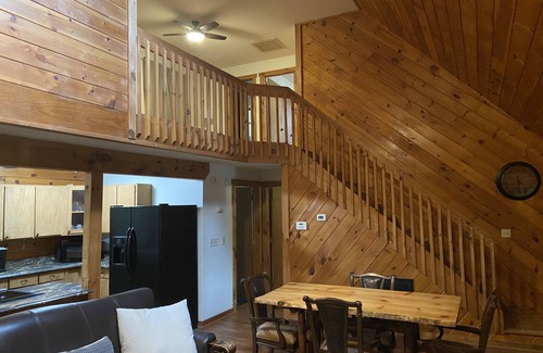 Our log cabin is the perfect getaway nestled on three acres. You will be able to relax with the whole family or friends. Our cabin has 3 bedrooms and 2.5 baths. It is a two story real log cabin with a warm and cozy fireplace. There is a king downstairs with an attached full bathroom. Upstairs has two bedrooms with queen beds, full bathroom, and a loft with a sleeper sofa. The kitchen is stocked with the necessities, including a Keurig duo for regular coffee or pods, an air fryer, and new stove. There is not a dishwasher. Whatever brings you to town--come stay at a spacious cabin that is convenient to everything. There is a fenced yard out back with firepit for pets and smores (please do not burn trash in the fire pit). The house is set back on the property and there is plenty of parking space for trailers, etc. All kids, pets, and hunters welcome!