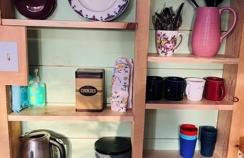 The cabin sleeps 4, two in a cozy bedroom with a queen bed and two more in a loft with twin beds. In the winter, guests can curl up in front of the wood stove and in the summer, ample windows makes the cabin breezy and fresh. BowHaven features a kitchenette with induction burner, microwave, electric kettle, coffee maker, and fridge. From May through November, the cabin has running water for dish and hand washing from a rain collection system. Drinking water is provided year round.