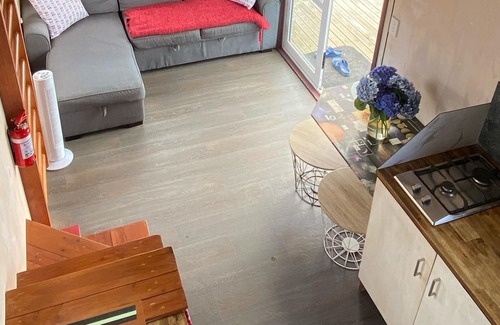 The mini home is contains a kitchen, bathroom with a compostable toilet and a mezzanine bedroom. An outside living area to relax and enjoy the serenity of nature around you.