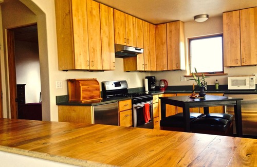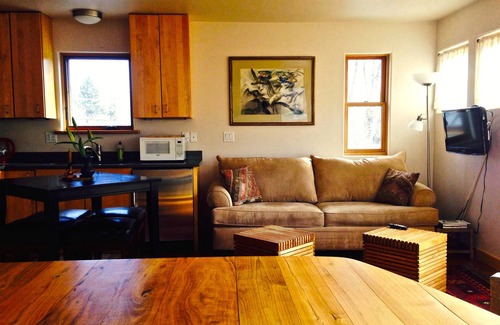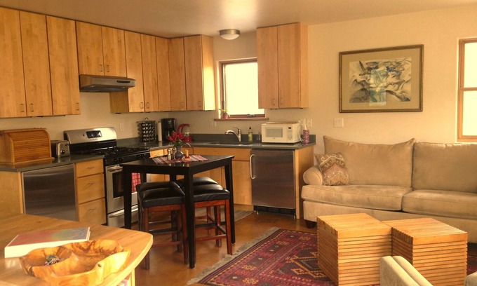 While vacationing in this home you'll have 600 square feet of beautifully custom built private living space on the second floor above the quiet downstairs Helios Arts Center. It has one bedroom and a bathroom to the north and a larger living area on the naturally sun-lit south side. The fully functioning kitchen/dining area is open to the living space where you'll find a hide-a-bed couch and Comcast cabled TV/WiFi. Winter renters need not fear cold feet as the in-floor radiant heat will keep you nice and comfy.