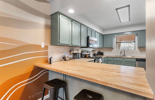 ☀ Cozy dining room with seating for 8 (+ 2 bar top seats) aside a fun mural!