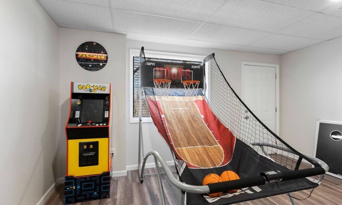 The house features 4 large bedrooms + a game room, packed with basketball, corn hole, a Pac Man arcade game, foosball, and a smart TV. The main level of the home includes a fully equipped kitchen, a comfortable living room with a fireplace, and a dining area that seats 8, plus two additional bar seats.