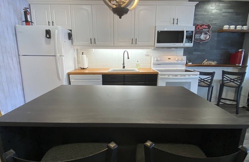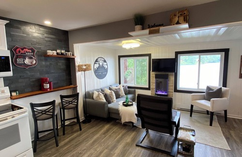 QUIET Lakefront renovated modern pet-friendly cabin for total relaxation! NOTE: We do not permit loud gatherings or loud music. This fully renovated 2-bedroom cabin is on Lac Lacroix which is a quiet lake in the hidden gem of a community of Messines. Many outdoor attractions nearby. No motorized boats allowed on the lake, so your stay is guaranteed to be zen! Relax and unwind on the fabulous deck overlooking the lake which has a canopy that can be used to cover the dining area. Excellent swimming off the dock in clear calm water with sandy bottom. Enjoy the lakeside fire pit or cozy up under the outdoor heat lamp near the sectional couch. Fish, sunbathe or kayak from the dock. Inside, the sectional overlooks the tranquil lake where the loons can be seen drifting by. Kayak and water toys are available for your use. Discover the attractions in the area! Cycling paths, hiking trails, local crafts, baked goods and more! Lots to keep the young ones entertained. Messines has invested heavily in its community centre which is a few km away. It has pickle ball, shuffle board, tennis and basketball courts available for all to use at no cost with plenty of free parking available. Parking is also free for anyone to bike along the paved bike trans Canada path. Many, many hiking trails, skidoo and cross country ski trauks are all nearby including Mont Morissette trails with a lookout tower which is a must see!