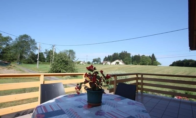 Pleasant cottage with separate entrance and level access to the terrace from the kitchen. Mountain setting, at an altitude of 600 meters, ideal for hiking with wide open spaces and a few kilometers from the spa and fitness resort of Plombières-les Bains Calodaé, or its casino. Groceries, doctor 4 km away. Located 7 km from the center of Val d'Ajol. Remiremont, its arcades, its Venetian carnival 14 km away. Equestrian center 13 km away in Le Girmont Val d'Ajol Equivigotte. Cottage in a house. Separate entrance on the 1st floor via an external staircase. 1st and 2nd floors: 1 bedroom (1 double bed). Living room with lounge area (sofa bed). Kitchen. TV socket. Bathroom with shower. WC. Electric heating. Garage. Terrace with garden furniture and barbecue. Large shared grounds. Charges included. Adjoining the owners' house and another cottage.