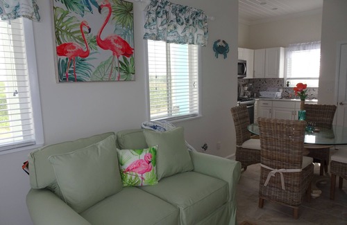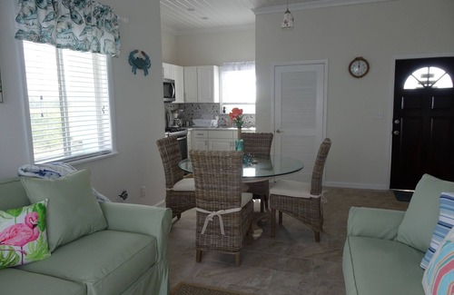 If dining in is your preference, a fully equipped kitchen with major appliances awaits you. Make yourself at home with a standard size Whirlpool cooking range, refrigerator and microwave oven; toaster oven, beverage blender and coffee maker; and a full complement of cookware, bakeware, dinnerware, drinking glasses and flatware. A stackable washer and dryer stored in its own room also complements the amenities of this modern cottage.