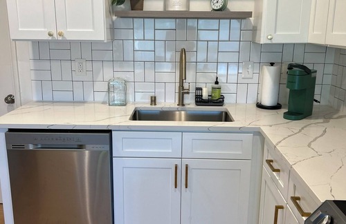 • Fully equipped kitchen with fridge/freezer, stove, oven, microwave, coffee maker, and cookware. Beautiful quartz countertops, soft close doors and drawers, and elegant tile backsplash.