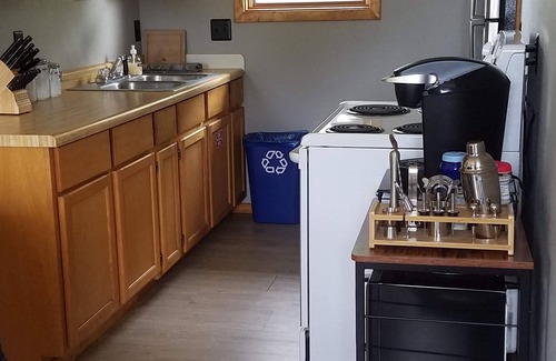 A full size kitchen with a full size refrigerator, stove, and plenty of counter space is available for guests. The kitchen is equipped with a few pots and pans, plates, bowls, glasses and mugs, knives, towels, and washcloths as well as all the standard equipment. A microwave and toaster oven make meal preparation a breeze. There is a Keurig machine, and a couple k-cups will be provided for each day of your stay. Standard bath towels will also be provided.