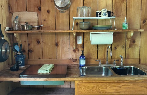 The cabin is located on an old apple orchard and budding homestead. It is off-grid and powered by solar. It is a short walk from the parking area (75 steps uphill). The cabin is one room with a kitchenette, hot outdoor shower, and outdoor compost toilet. The cabin can sleep up to three people with a queen bed, futon, and pullout couch. The kitchen includes a gas range, mini fridge, a sink with running water, and basic kitchen cook wear. A propane heater is available for extra warmth on a chilly night. A shelf equipped with books and board games. A propane grill sits on the front porch, and a fire pit out front. The hot outdoor shower and compost toilet are 25 steps from the front door tucked into the tree line. The pond sits in front of the cabin, a picnic table sets by the edge.