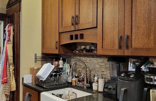 If your looking for a quiet, relaxing getaway or a base camp. This 2 bedroom older farmhouse has lots of charm and places to chill on the deck with a cup of coffee and a good book while enjoying a tranquil almost zen like garden setting and koi pond. Large upstairs bedroom has a kingsize bed, fireplace and half bath with washer and dryer. The living room is great for entertaining and has a round game table perfect for playing our well-stocked board games. Downstairs bedroom has a queen bed with zero gravity remote. My home if filled with momentos, crafts and books so if you want a sterile hotel like environment this won't be the house for you. There are also air beds available if needed.