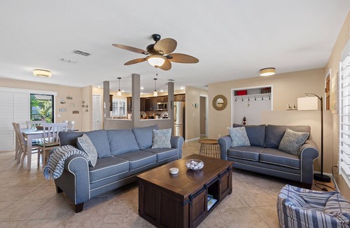 Outdoors, Pelican’s Cove has you covered with everything you need for fun in the Florida sun—two kayaks, beach chairs, a foldable wagon, and more, all stored in the garage for your convenience. After a day of exploring, enjoy the backyard patio under the shady trees, or unwind in the cheerful primary suite with a king bed, Roku TV, and private bath. The guest bedroom features a queen bed and extra sleeping space with a twin air mattress. With amenities like a washer/dryer, Roku streaming, wireless internet, and plenty of linens and beach gear, Pelican’s Cove is the perfect home base for your next family adventure.