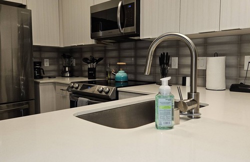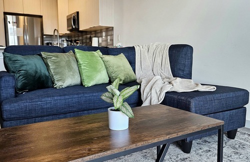 This is a fully furnished apartment, with a fully equipped kitchen. Ideal for travelers who plan to stay for long periods of time. Located near all areas of interest such a shopping centers and grocery stores. This location comes with additional amenities, whether you want to stay fit, or have a furry friend traveling with you. This space welcomes all types of travelers.