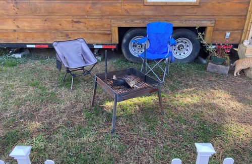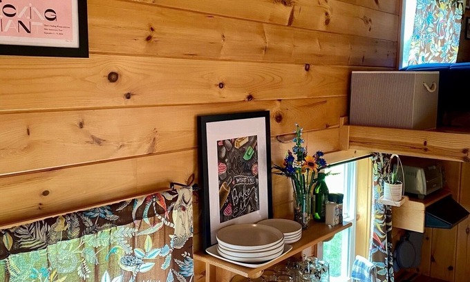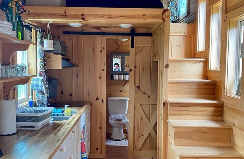 Escape to this cozy and thoughtfully designed tiny home, perfect for a relaxing getaway. The home features a queen-sized sleeping loft with soft bedding for a restful night’s sleep, and an additional twin air mattress stored in the second loft, which doubles as a cozy seating nook.