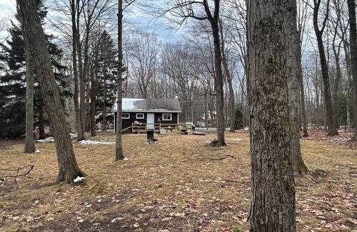 Near Kalihari waterpark, Camelback ski and waterpark, and Mt Airy Casino. Rustic, cozy and clean 2-bedroom cabin. Queen sized bed, single over double bunk bed, living room sofa bed, clean linens and towels included. Front covered porch, rear deck, and yard with fire pit. Enjoy the tranquil surroundings and modern amenities like a gas fireplace, AC, WiFi, kitchen essentials including coffee and creamers. We can't wait to welcome our guests to this marvelous retreat.