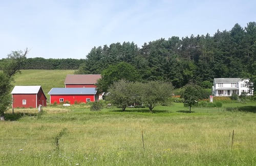 Our farm offers serenity and an occasional veggie from the garden. Asparagus, raspberries and grapes to savor, cows just over the fence, bonfire pit, charcoal grill.