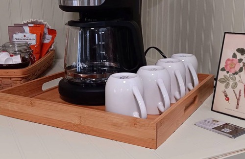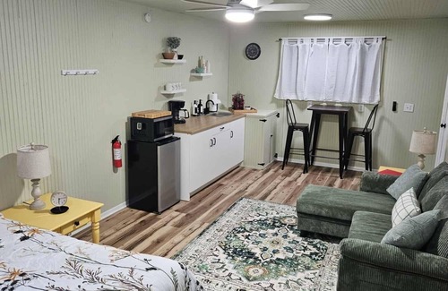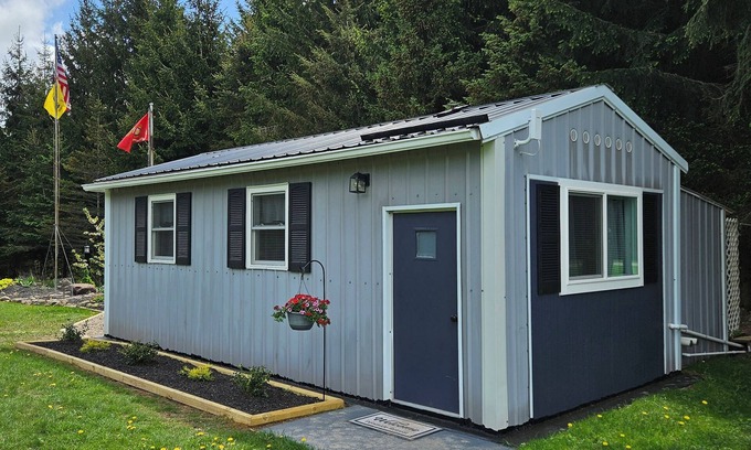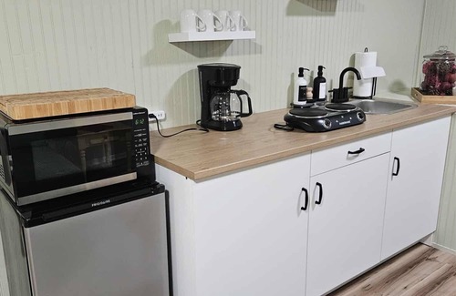 Inside the cabin is a kitchenette with all of your basic amenities including a double hotplate, cooking utensils, sink with hot and cold running water. The cabin also offers heat and air conditioning, ceiling fan, refrigerator, microwave, coffee maker, French press (with coffee, creamer, and sugar), and hair dryer. On the outside of the retreat there is the enclosed shower house with hot and cold water. The toilet (Composting) is also outside in its own private enclosed structure.