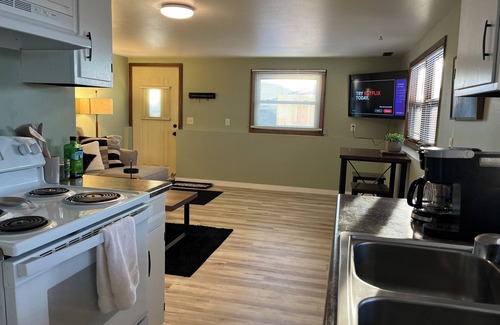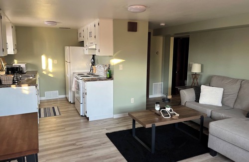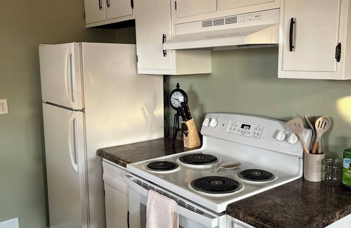 Cozy 1 bed 1 bath lower level updated apartment tucked into the side of a forested hill a short drive to the local hospitals and stores. You'll have a full kitchen with dishwasher, queen bed, laundry access on the same level, stores within walking distance, walking distance to the river trail and other biking/running trails. Cooking essentials, fast WiFi.