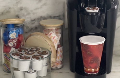 Fully equipped kitchen plates, cups, bowls, Keurig coffee machine, ice machine etc