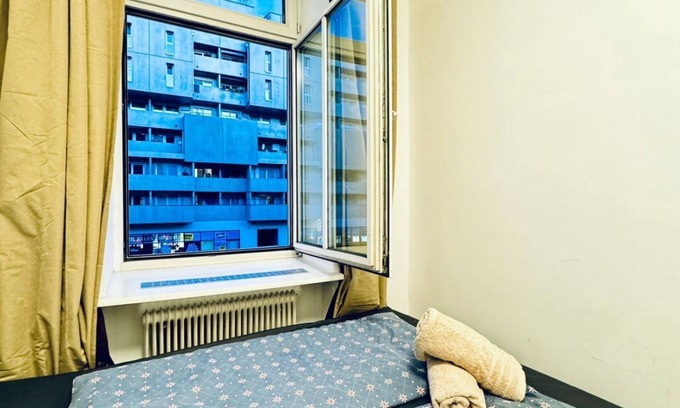 The bathroom is modern and shared with other guests, offering all the essentials you need, including fresh towels, quality toiletries, and a spacious shower. Its clean and functional design ensures that you have everything you need for a refreshing start or end to your day. The apartment’s shared spaces are bright and airy, with large windows that allow natural light to fill the rooms, enhancing the inviting and cheerful atmosphere.