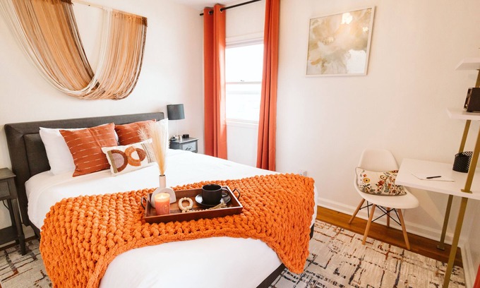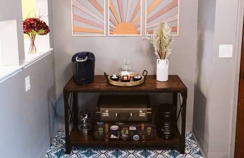 Step into your cozy 2-bedroom, 1-bathroom retreat, nestled in a serene mid-century setting complete with a delightful outdoor area. Inside, the living space is warmly decorated, providing a comfortable nook equipped with a dedicated workspace and a TV featuring Roku for your entertainment. Ready for your culinary adventures, the kitchen includes essential appliances, a welcoming snack basket, and complimentary coffee to brighten your mornings. Please note that your home is part of a multi-family dwelling, ensuring your privacy and convenience with its own private entrance.