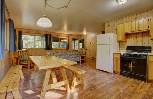 Elm Cabin is a gem of a cabin designed for those who are looking for a peaceful Northwoods escape! This cabin has a large, fully equipped kitchen, a screened front porch on a quiet 394-acre lake with great fishing. This year-round cabin has one bedroom with 2 twin beds. The other bedroom has 2 sets of bunkbeds. Elm has a full bathroom with a commode, vanity, and shower & tub. The cabin has large windows that open to catch the summer lake breeze from Big Crooked Lake.
