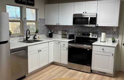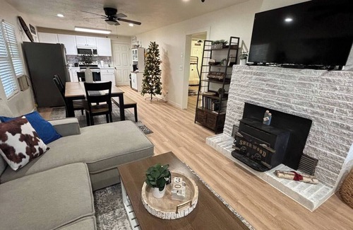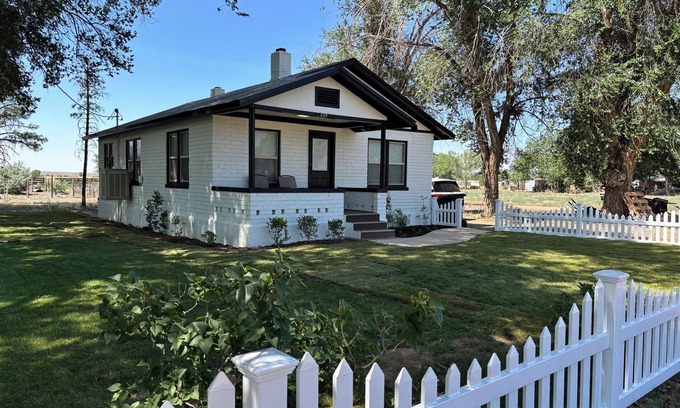 Super cozy, cute & completely remodeled little rancher house. This house was built by a family member years ago. He was a cattle rancher. There are 2 bedrooms with comfortable mattresses. The living room has a sleeper sofa with a memory foam mattress. There is a sitting area in the front porch. TV, wifi and a DVD player stocked with DVDs. Coffee hutch with a Keurig and hot chocolate. Yard & picket fench this summer. This home is perfect for a couple and will also fit a family
