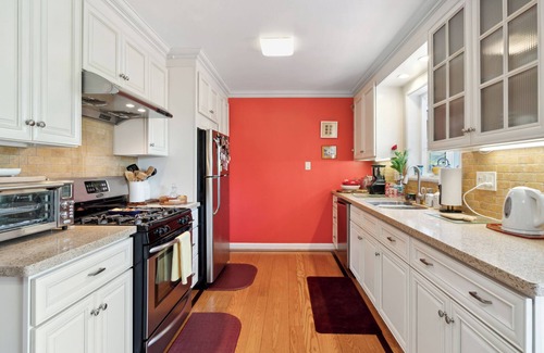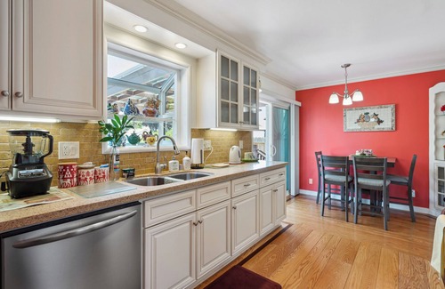 Welcome to our family home we have owned this home since the 1980's and is only available when our matriarch travels for the Summer. There is a spacious living room with a dining table, gas-powered fireplace, and TV. Recessed lights, wide sun-filled windows, and wood floors throughout. The eat-in kitchen features stainless-style appliances with a gas stove, custom cabinetry, and all kitchen utensils. Only 1 bedroom can be used. The zen garden is LARGE and features a patio and dining area.