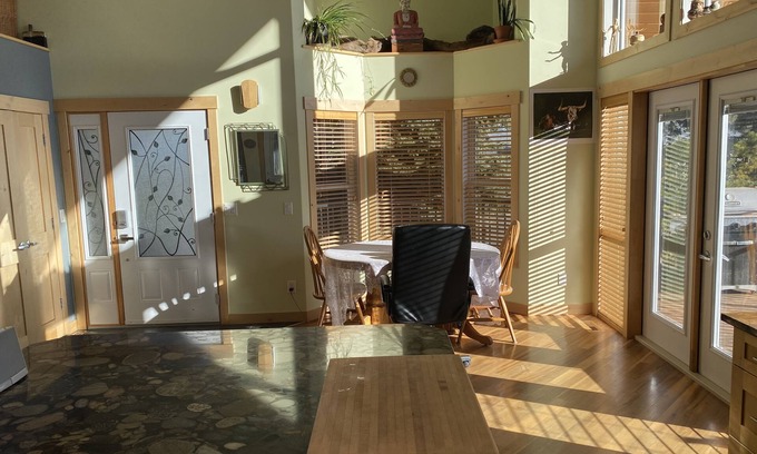 This home is peaceful and Elegant. It has lots of space and privacy. There is a large outdoor deck with a table and chairs. It has off street parking. This kitchen is fully equipped for culinary adventures.