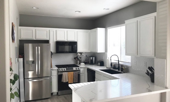 Inside the home you’ll be greeted by spacious living areas filled with natural light and modern finishes. The 4-bedroom, 3-bath home features 1,633 sq. ft. of well-designed space. The driveway allows parking for 2 cars and street parking for a 3rd car. The backyard is quaint and private, perfect for cool summer nights. Additionally, the cozy fireplace and couch in the living room is perfect for the cooler winter nights. In the garage you’ll find gym equipment available for your use. The home was built in 2002 and has recently been renovated with new flooring throughout, upgraded kitchen countertops and appliances, tankless water heater that provides nearly immediate hot water, and a new AC system with smart thermostat that cools the house in minutes.