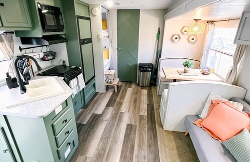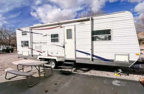 Beautifully remodeled 28ft RV located in Leeds, Utah. Sleeps 6 comfortably with queen bed, two single bunks, a pullout couch, and fold down dining table. Located in the quiet, shady Leeds RV Park that includes laundry in the clubhouse, public showers, bathrooms, and dog park. Conveniently within 10 minutes of Walmart, Costco, and Outlets. Zion National Park, Red Cliffs, Quail Creek Reservoir, Sand Hollow Reservoir, Snow Canyon State Park and many local hikes are within a 30 min drive as well!