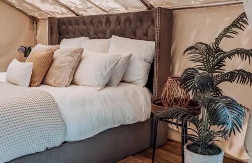Oceans Edge Eagle Resort has luxury glamping tents available on large wooden decks wood-burning stoves, private deck space front and back of the tent, and outdoor firepits.