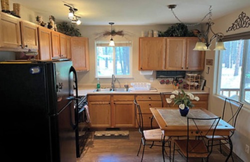 This 2-bedroom, 1-bath scenic and tranquil home is nestled among the pines. Just seconds to the river or lake. Primary bedroom has queen bed, 2nd bedroom has a queen and XL twin bunkbed on top. Fully equipped spacious kitchen with microwave. Spacious bathroom with a large closet including stackable washer and dryer. Completely covered front porch with 2 ceiling fans and gas grill with seating for 6. Quaint back deck for morning views.
