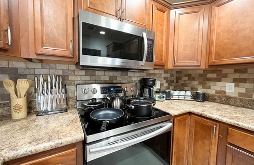 Fully equipped with all cooking necessities. You'll have cutting boards, pots, pans, a tea kettle, knife set, a drip coffee maker, toaster, mixing bowls, pasta strainer, can opener and spices