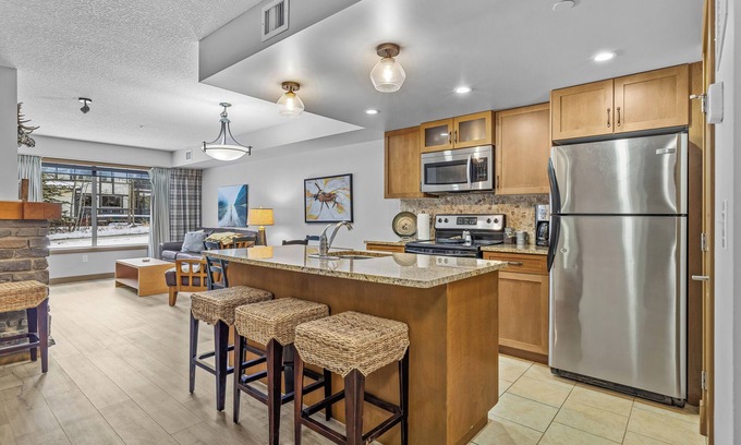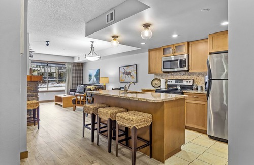 Beautiful cozy mountain themed condo! This 1 bedroom, 1 bathroom with a pullout sofa bed is the perfect stay for any small group or family. It is located at the Copperstone Resort in Dead Man's Flats, Alberta, a very short drive to Canmore (just over 5 minutes). The entire condo will be yours to enjoy with plenty of amenities. The contemporary kitchen has stainless steel appliances, granite countertops, and an island with bar stools. The unit is stocked with all the cookware, cutlery, and kitchen items that you may require. 4 of each item (plates, bowls, cutlery, etc) will be provided. All clean towels and linens will be provided as well. The condo has a work space with desk and chair, as well as a brand new updated bathroom and flooring throughout! This main floor unit also features a patio with a table and chairs for you to enjoy. The resort features heated underground parking, a hot tub, fitness room, and pool table room. All being completely complimentary to your stay. There is easy access to plenty of trails allowing you to explore the beautiful surroundings including Pigeon Creek. I hope you enjoy this beautiful luxury condo in the Rockies and I look forward to making this a comfortable experience.